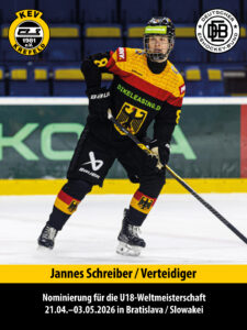 Starke Nachricht für den KEV81-Nachwuchs: Unser Spieler Jannes Schreiber wurde auf Vorschlag von U18-Bundestrainer Andreas Becherer zur WM-Vorbereitung Phase II sowie zur U18-Weltmeisterschaft der deutschen